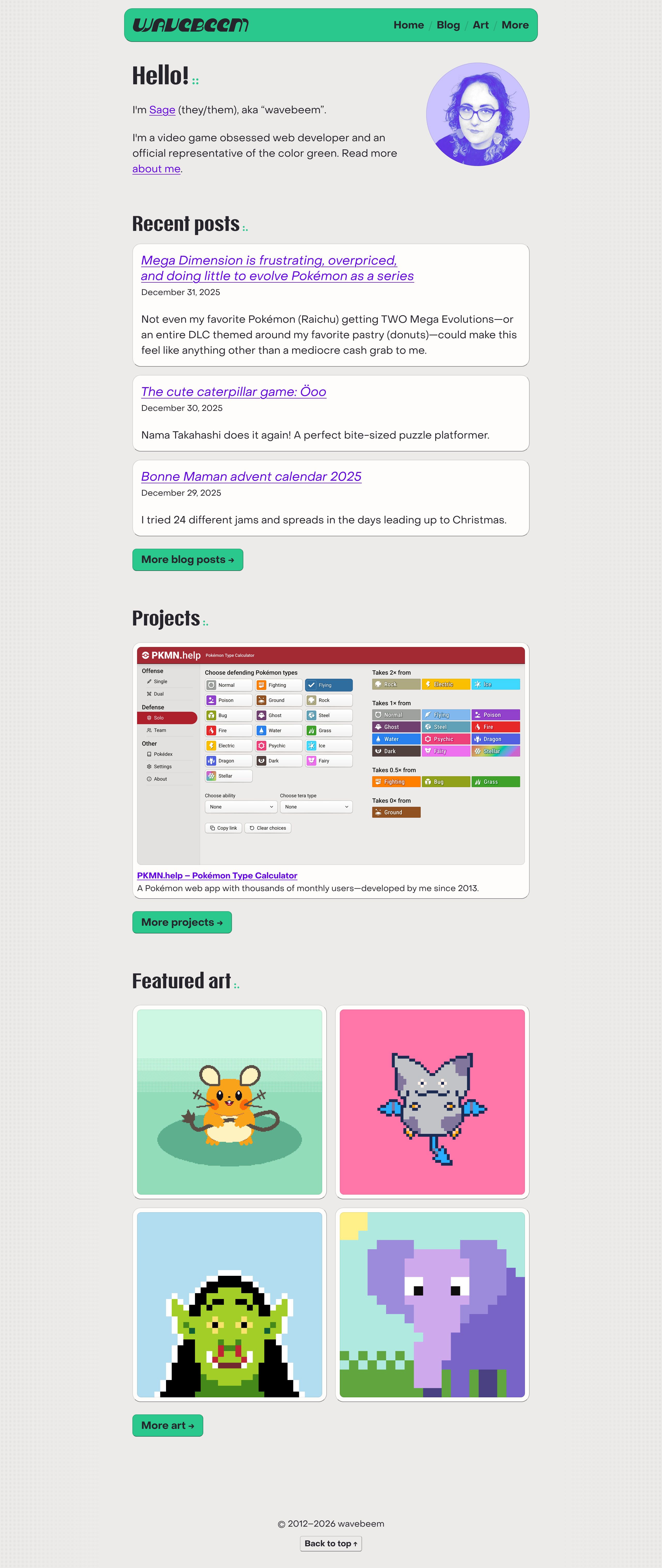 Technically using 1bit-ui, I added lots of extra colors to this page. The fancy cards look cool, especially alongside the pixel art portrait I made, but it's an idea that was only half heartedly implemented.